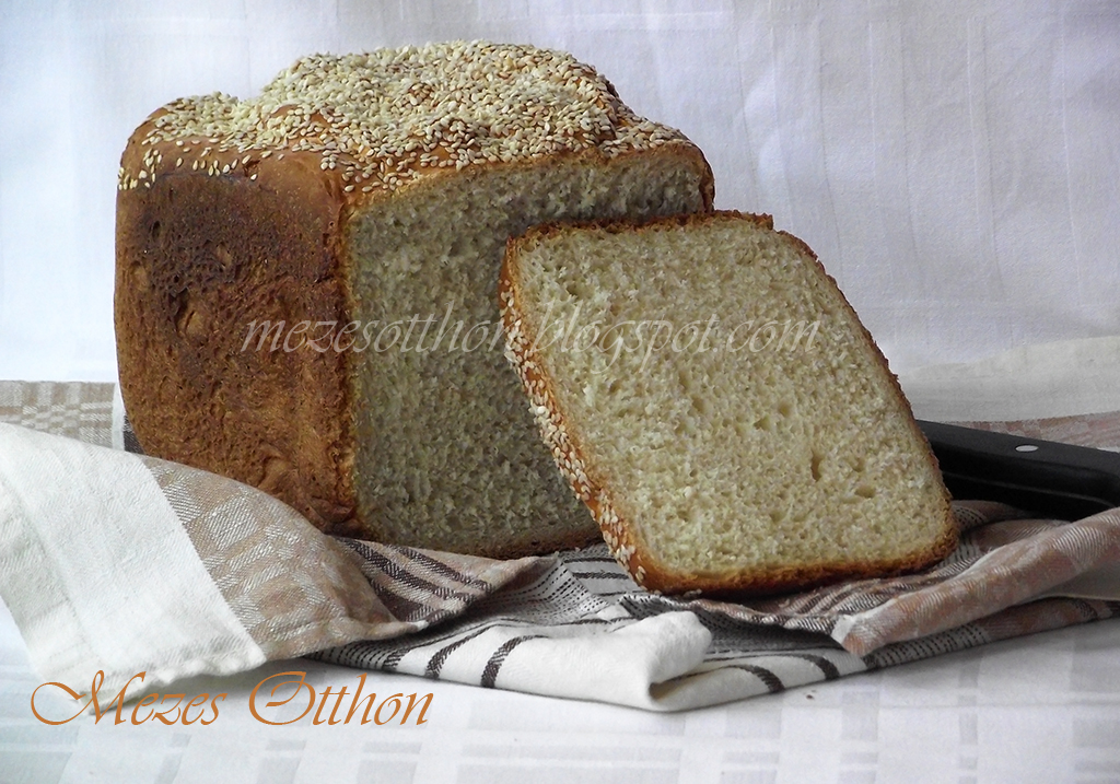 Elkészítés: A hozzávalókat a fenti sorrendbe az üstbe teszem. (A tészta állaga ne legyen túl lágy, ne ragadjon az üst oldalára, de túl kemény se legyen. Utóbbi esetben 1-2 evőkanál folyadékot lehet hozzátenni.) A gép amikor összegyúrta a tésztát, a keverőlapátot kiveszem és utána hagyom kelni a gépben. Sütés előtt tojással lekenem és megszórom szezámmaggal a tetejét.