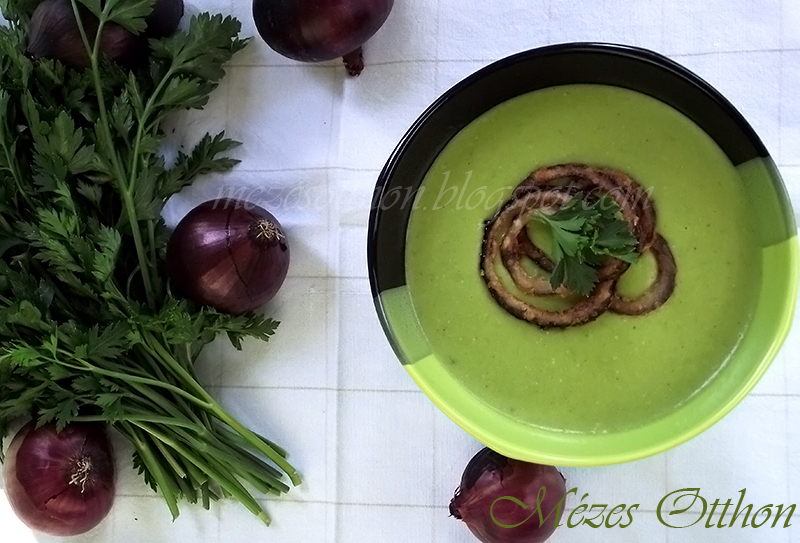 A krémlevest sült hagymakarikával, vagy pirított kenyérkockákkal tálalom.