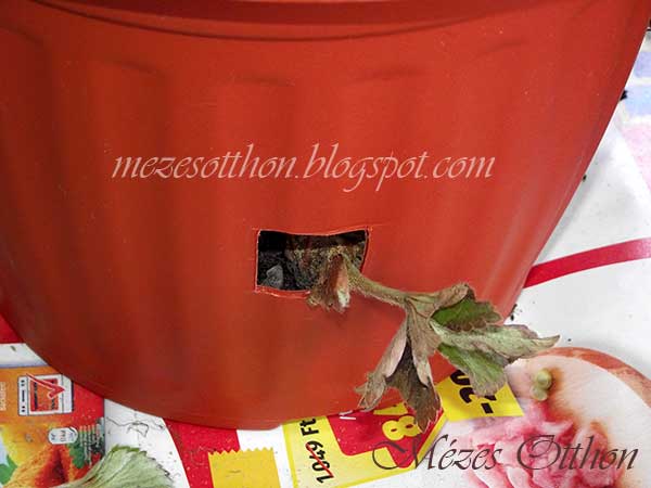 A műanyag cserépre vágjunk 4 kisebb lyukat.