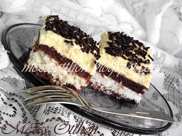 Az egyik kedvenc süteményem! Kakaós lapok közt kókuszos réteg és a tetején vaníliakrém. Ha választani lehet, hogy milyen édesség készüljön általában ezt kérem, vagy a karamellás szeletet.