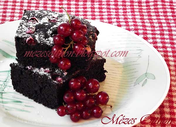 Elkészítés: A cukrot, vaníliás cukrot, fahéjat, lisztet, sütőport, szódabikarbónát, kakaót összekeverem. A vizet, az olajjal, az ecettel elkeverem. Majd a száraz hozzávalókhoz hozzáöntöm a nedves hozzávalókat és jól elkeverem. Sütőpapírral bélelt formába öntöm a kakaós masszát, tetejére ribizlit szórok. Előmelegített sütőben 25-30 perc alatt közepes hőfokon megsütöm.