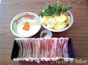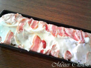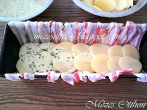 Egy hosszú formát kibélelünk a baconnal, a szeleteket szorosan, kissé átfedve rakjuk egymás mellé. A burgonyát vékony karikákra vágjuk, a tejszínt elkeverjük a tojásokkal, fokhagymával, apróra vágott petrezselyemmel, sóval, borssal ízesítjük.