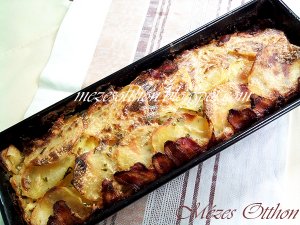 Előmelegített sütőben kb. 30-40 percig közepes hőmérsékleten sütjük, ha villával megszúrva a burgonya már puha, illetve a teteje ropogósra sült akkor kivesszük a sütőből.